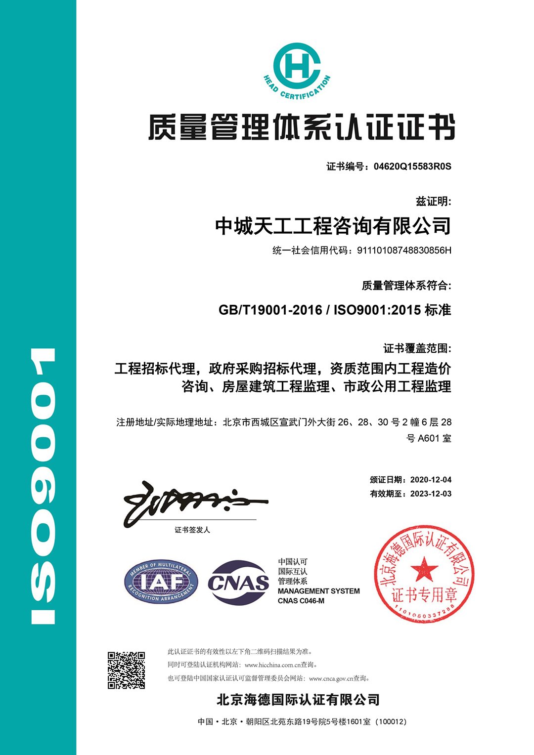 质量管理体系认证证书