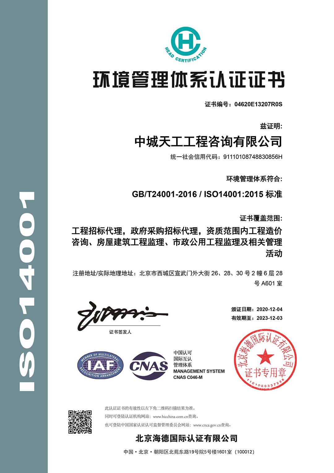 环境管理体系认证证书