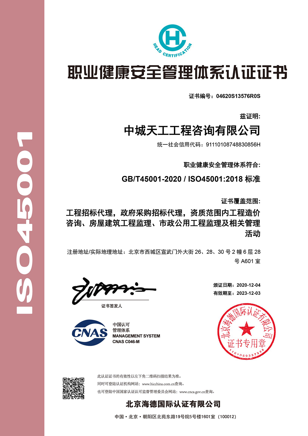 职业健康安全管理体系认证证书